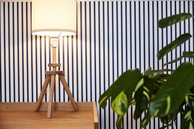 Added: striped wallpaper, pink armchair, light coffee table, rattan lamps, picture gallery, geometric patterned rug, rattan desk chair, wooden tripod lamp, wooden bench in bathroom, new flooring in entrance hall, plants.