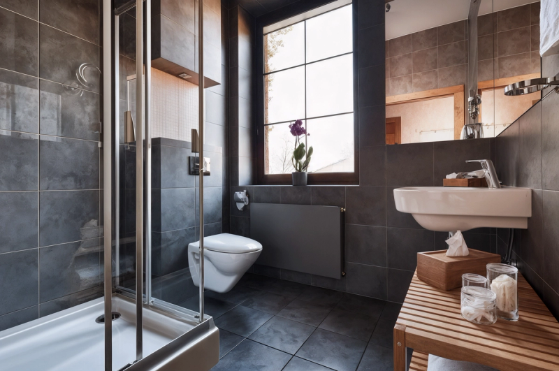 The bathroom? Graphite tiles, modern fixtures — a solid foundation, but cold and stark. It lacked warmth.