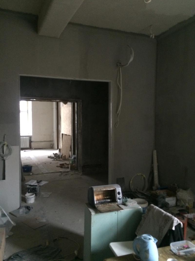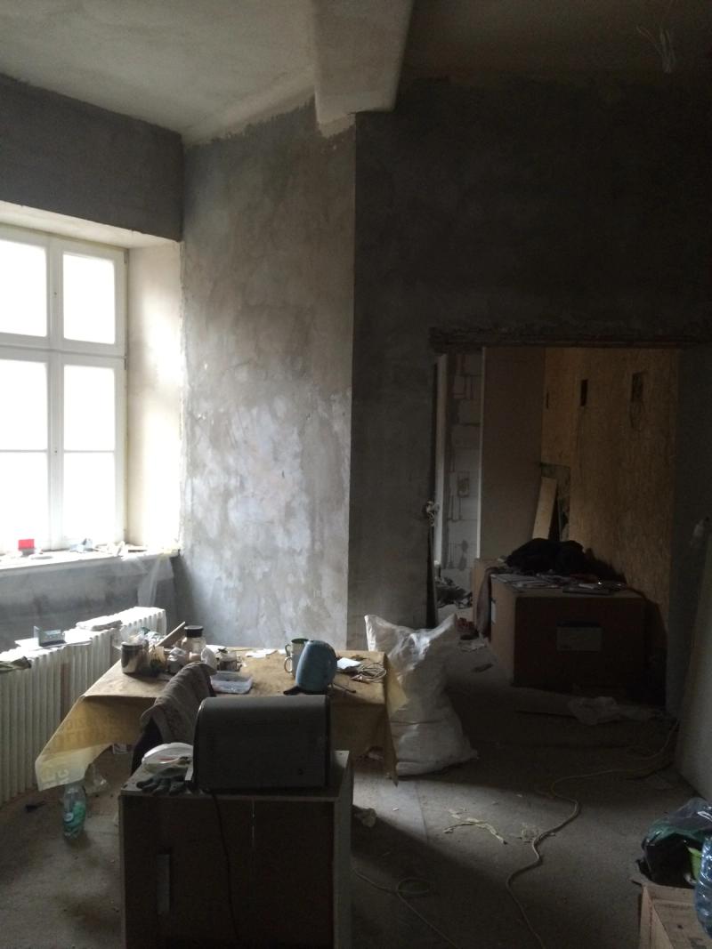 Parkiet - stary. Betonowy sufit. Białe ściany. Okno wychodzące na podwórze. Dwuskrzydłowe, minimalistyczne drzwi na korytarz. I drugie, prowadzące do garderoby i dalej, do łazienki.