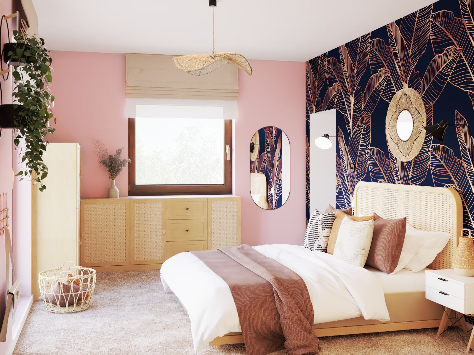 Zaproponowaliśmy róż. Nie pudrowy, nie dziecięcy — ciepły, stonowany, z domieszką łososia. Trzy ściany w tym kolorze. A czwarta, za zagłówkiem — tapeta: granatowe tło z dużymi liśćmi w odcieniu miedzi i złota. Botaniczna, odważna, dominująca.