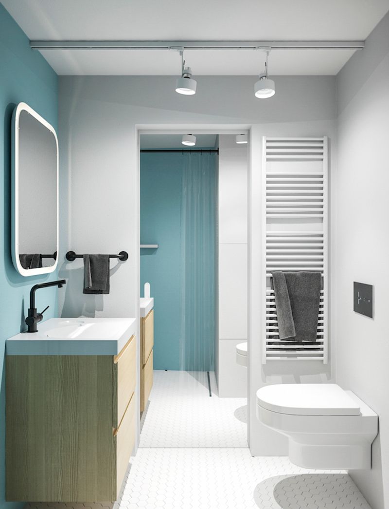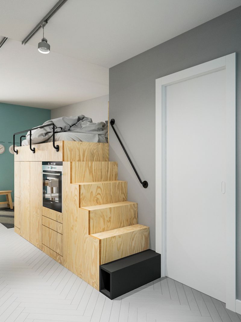 👉 garderobę — pod materacem. Tu lekki kompromis: trzeba się schylić, żeby wejść. Ale w środku są drążki, półki i nawet szafla zamykana na klucz, bo już na etapie projektu mieszkanie miało być przygotowane pod wynajem