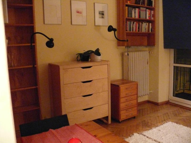 W reszcie przestrzeni — dwuosobowy stolik, który po odsunięciu od ściany zmieści cztery osoby. Rozkładana sofa dla gości(czyli jest też funkcja pokoju gościnnego ;-). Na turkusowej ścianie cztery zegary z nazwami miast — bo to mieszkanie projektowane z myślą o gościach z całego świata.Szuflandia — epilog