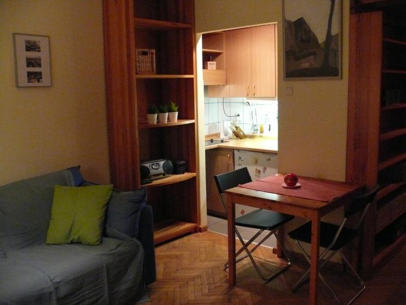 Aneks kuchenny w kawalerce — mała kuchnia z pełnym wyposażeniem